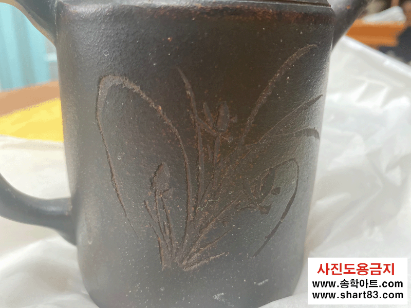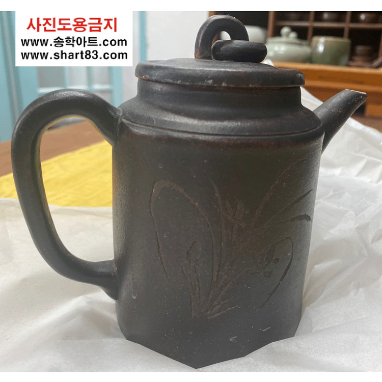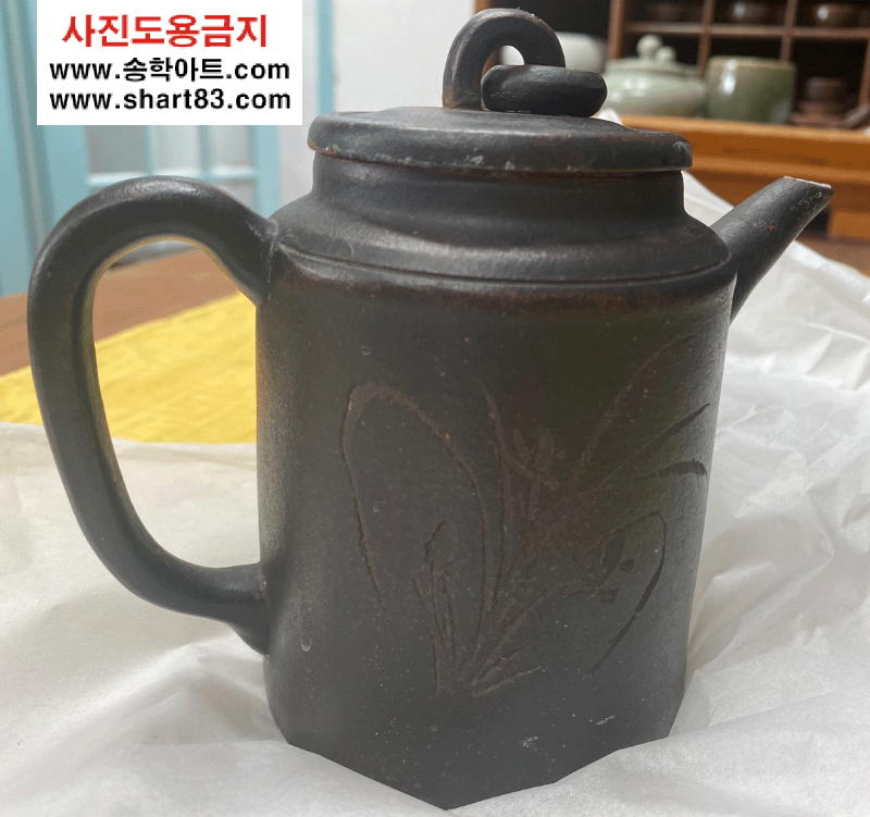 한면에는 난초 그림, 한면에는 한문에 새겨있는 매력적인 자기주전자.