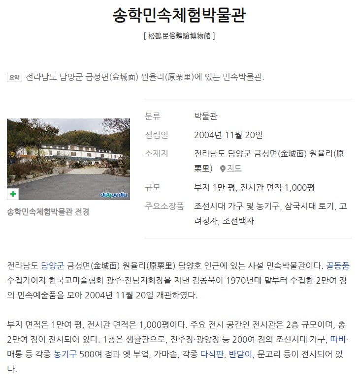 송학아트 고미술품 감정 전문 >>>> 1978년~1983년 "이조가구" 대표 1983년~2004년 고미술품매장 "송학당" 대표 1995년 초창기 광주 비엔날레 고미술품 특별기획 전시 책임자 1990년대 한국 고미술협회 광주지부 지회장 역임 / 전남 고미술품 감정전문위원 1987년~2004년 문화전시관 "송학문화관" 대표 2004년~ 2022년 "송학민속체험박물관(부지 1만평 / 전시관 1,2층 1천평 규모) " 관장 |