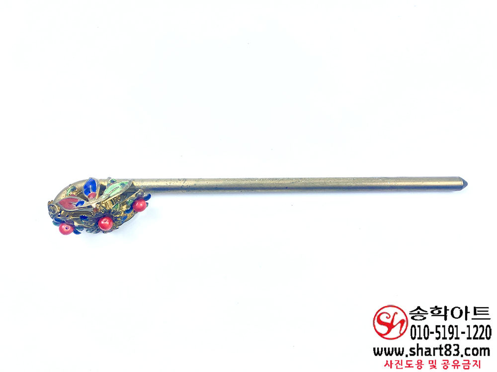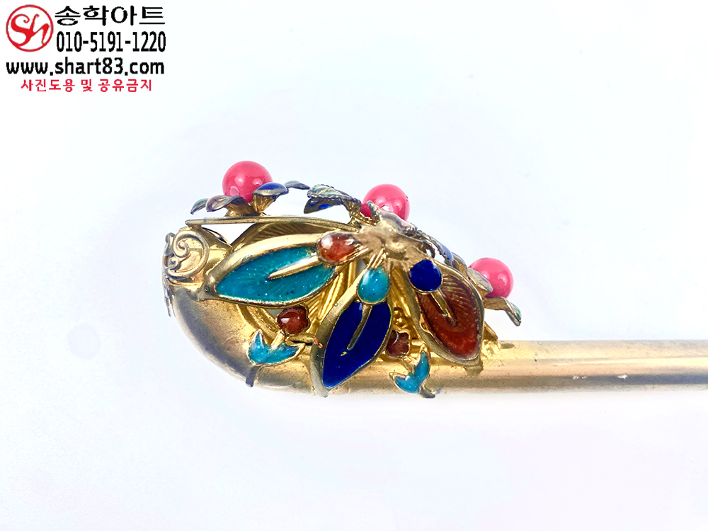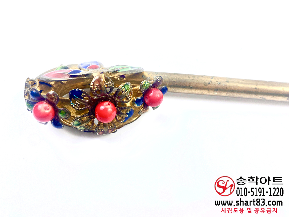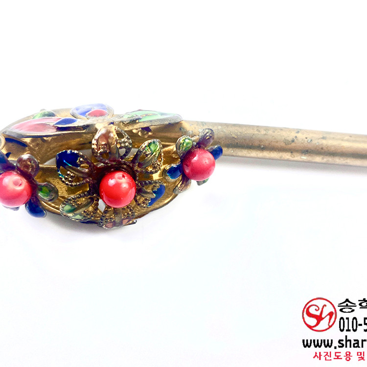 ▶ 설명 : 본 작품은 황동에 분금칠(粉金漆)이 더해진 칠보(七寶) 장식 비녀로,