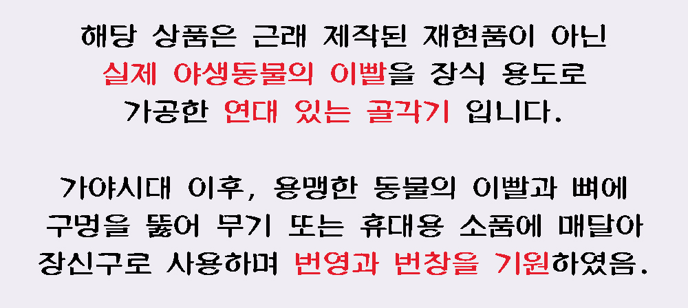 | 기타 사항 | ▣ 골각기 : 짐승, 물고기, 새의 뼈, 뿔, 치아 등으로 만든 도구 및 장신구 골각기를 처음 사용한 것은 후기 구석기이나 한국의 골각기는 신석기 시대부터 발견된다. 신석기시대는 수렵, 어로, 채집 등 생활과 관련된 실용적인 골각기가 많은 반면 철기시대 이후부터 장식구 같은 비실용적인 골각기가 점점 증가하였다. 가야시대 이후부터는 골각기에 구멍을 뚫어 무기 또는 휴대용 소품에 매달아 주로 장신구와 의례구 기능으로 사용되었다. |