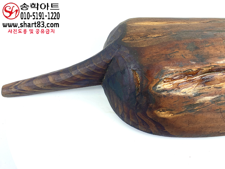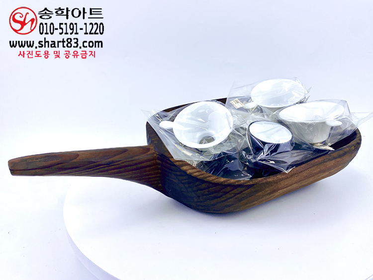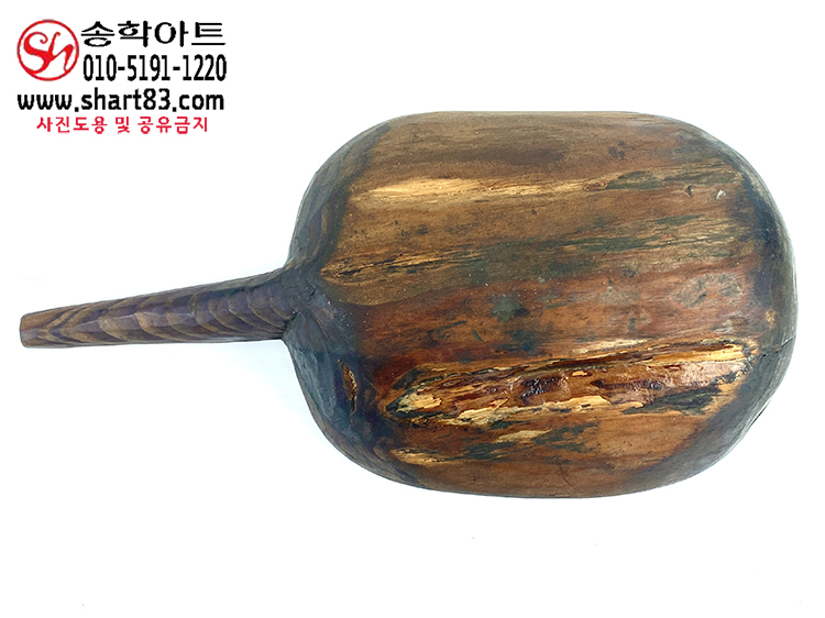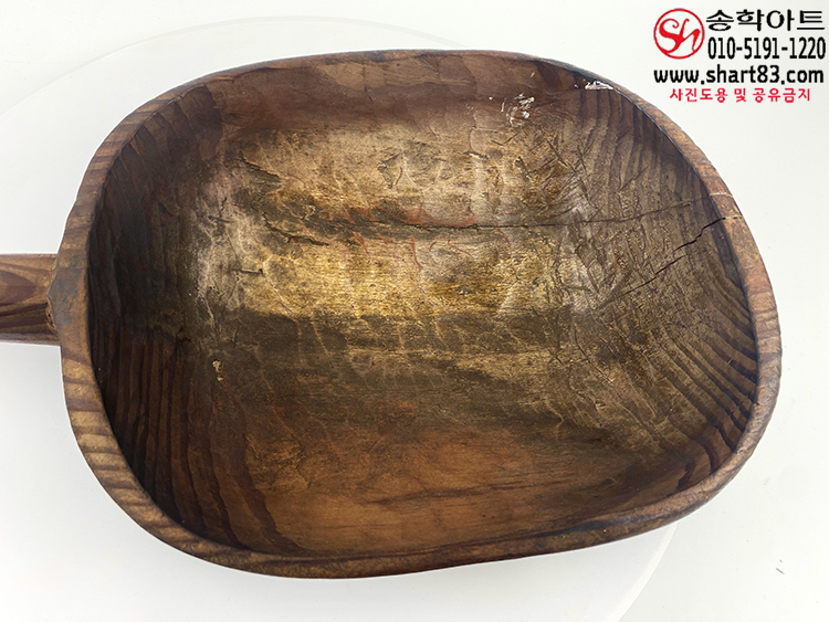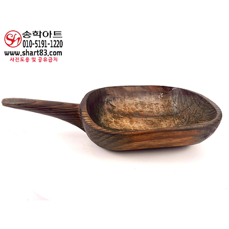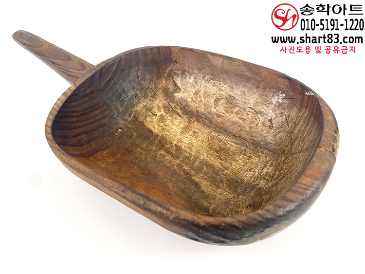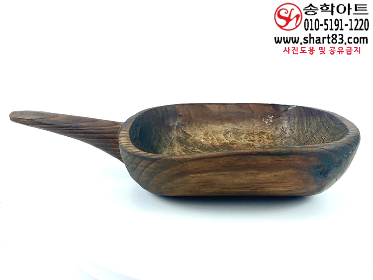 통나무를 거칠게 깎아 만든 타원 형태의 바가지이며 한쪽에는 원통형 손잡이가 달려 있음.