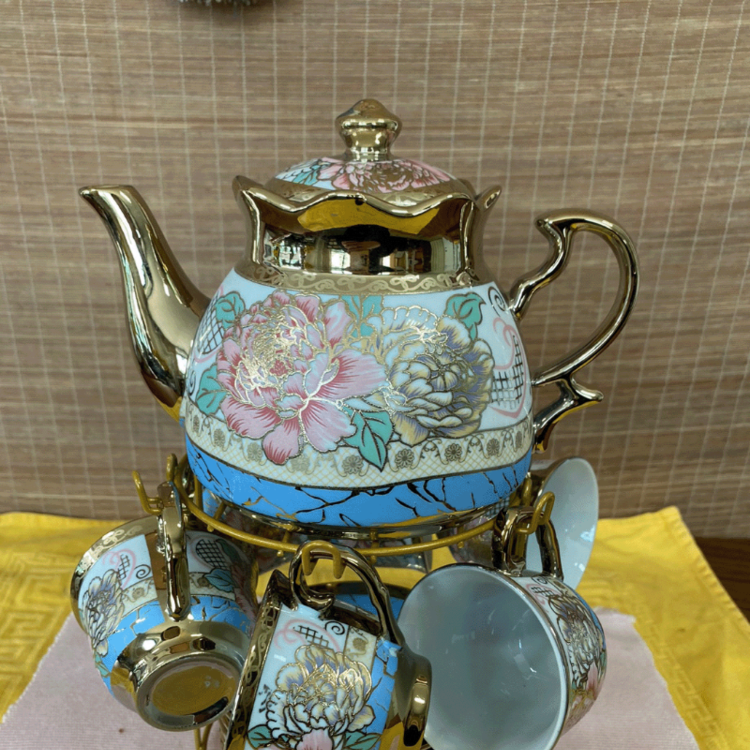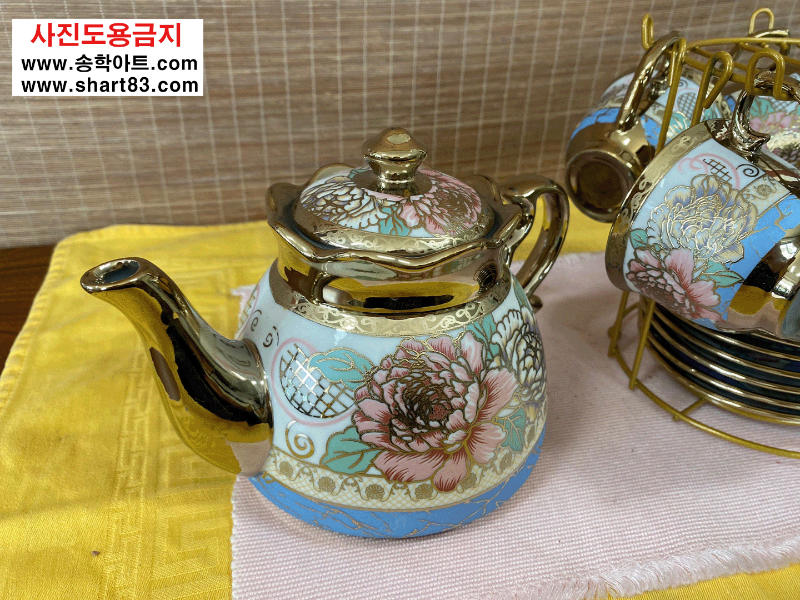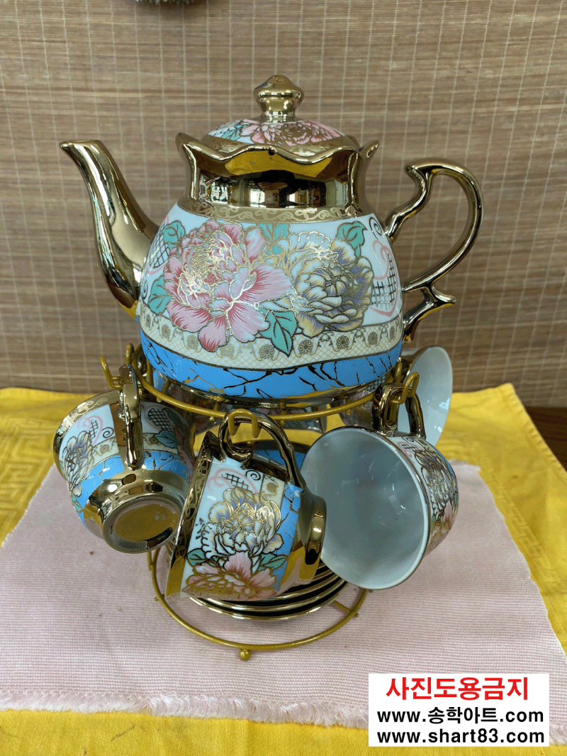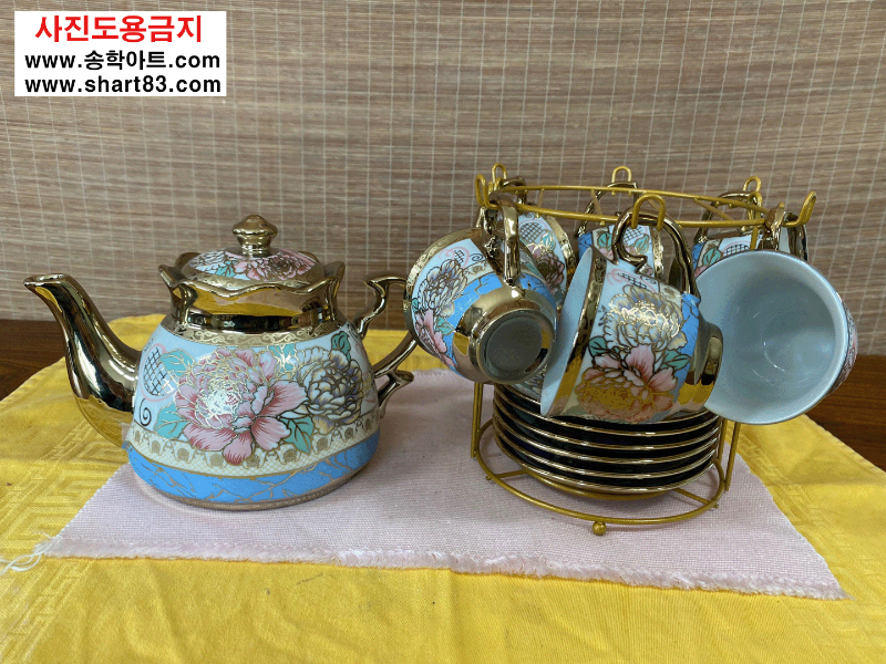 차주전자와 6개의 찻잔, 차받침에 트레이드 선반까지 1세트