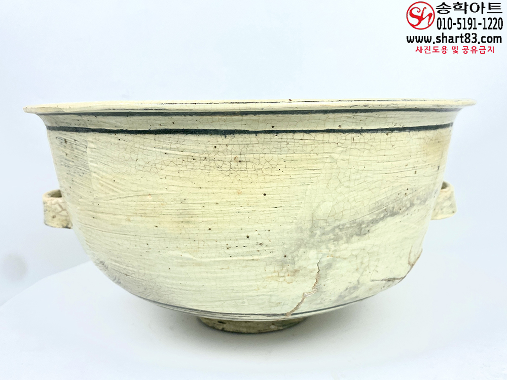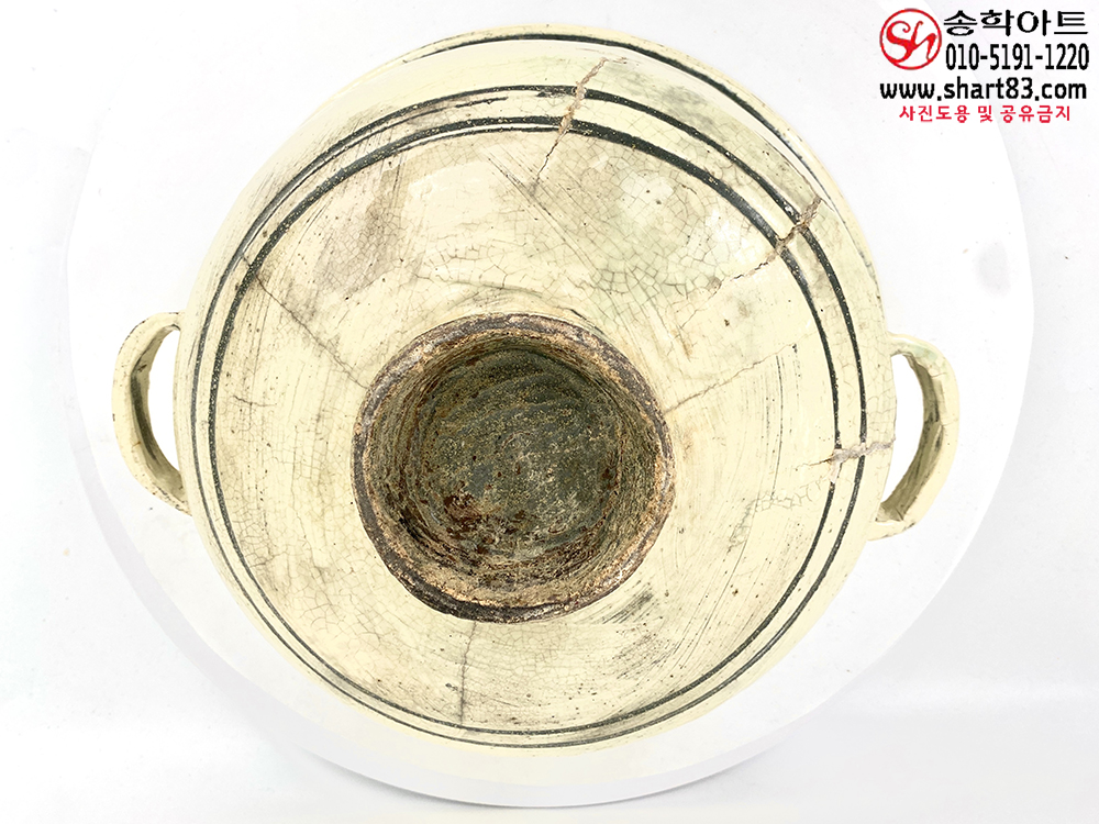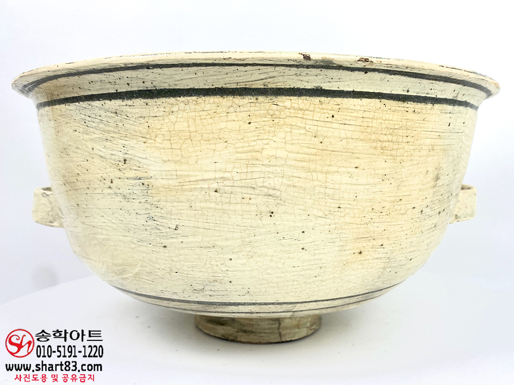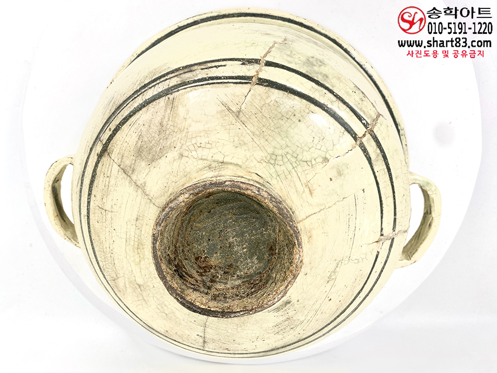 이 도자기는 표면의 붓질과 양 손잡이와 높은 굽이 특징.