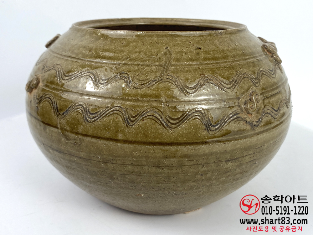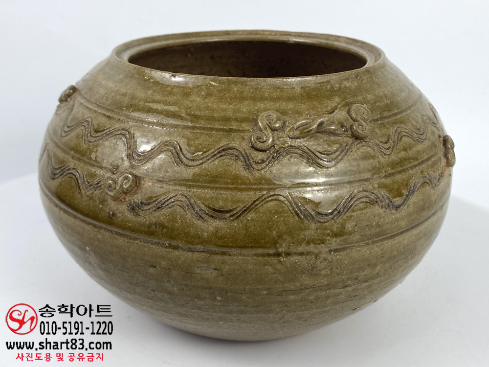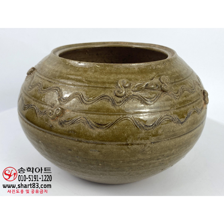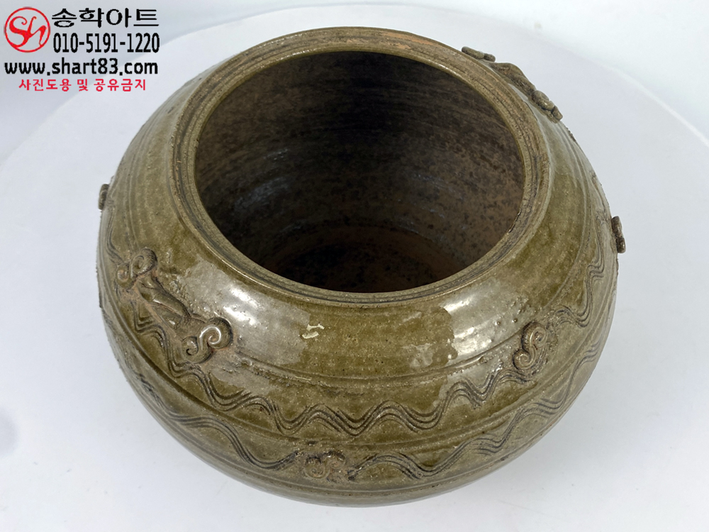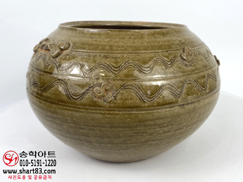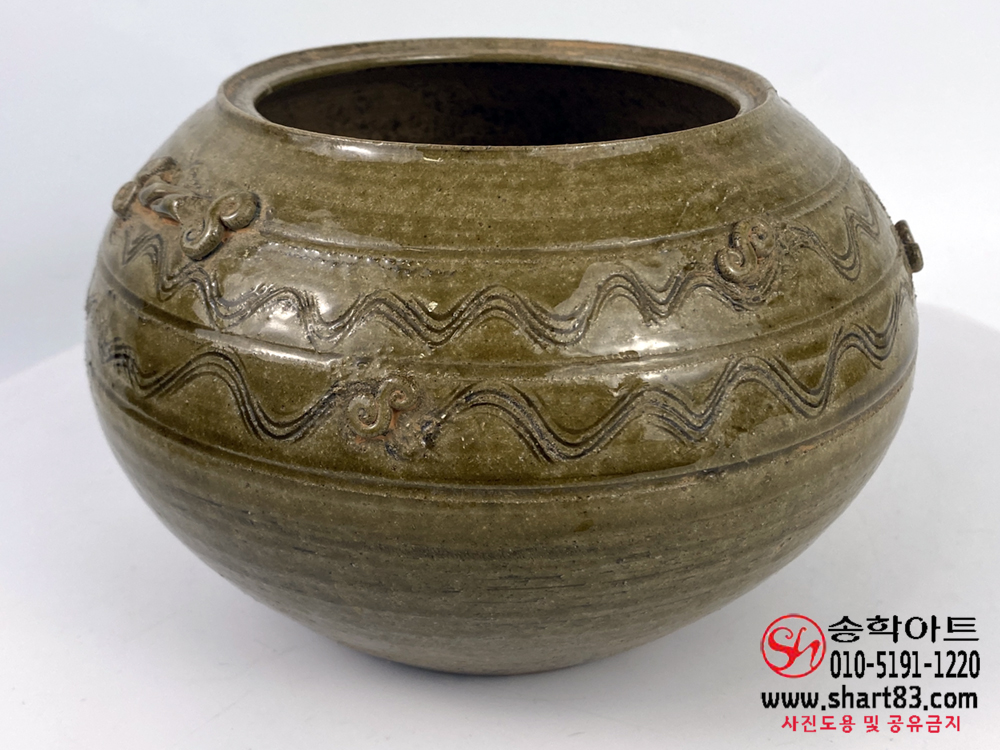 ▶ 참고 : 양각의 독특한 구옥 모양의 문양이 둘러진 청자 항아리