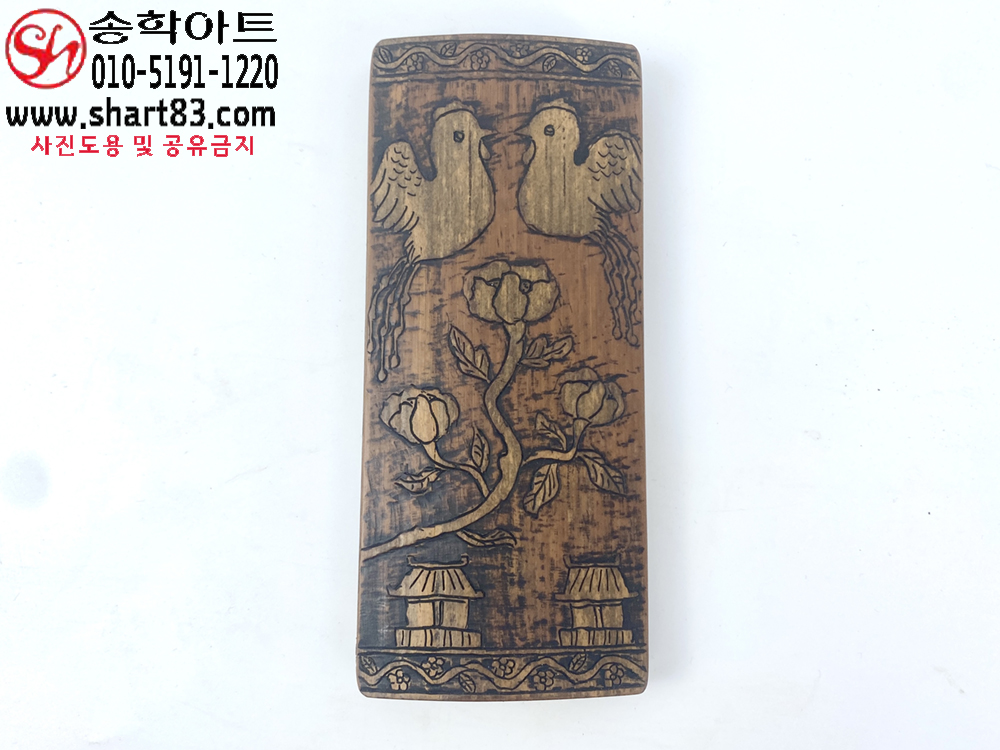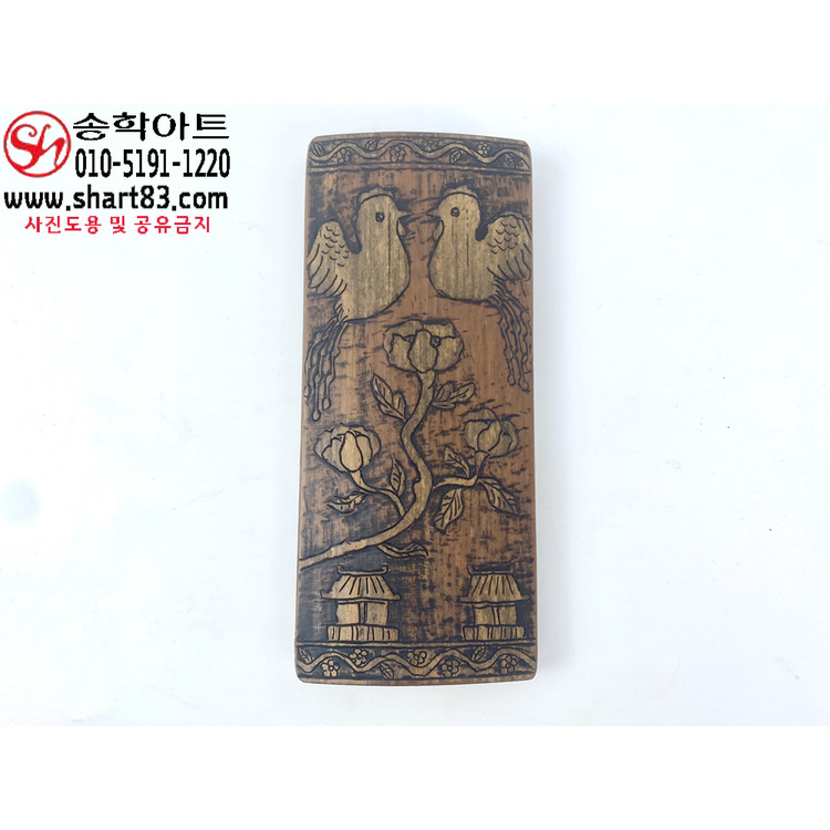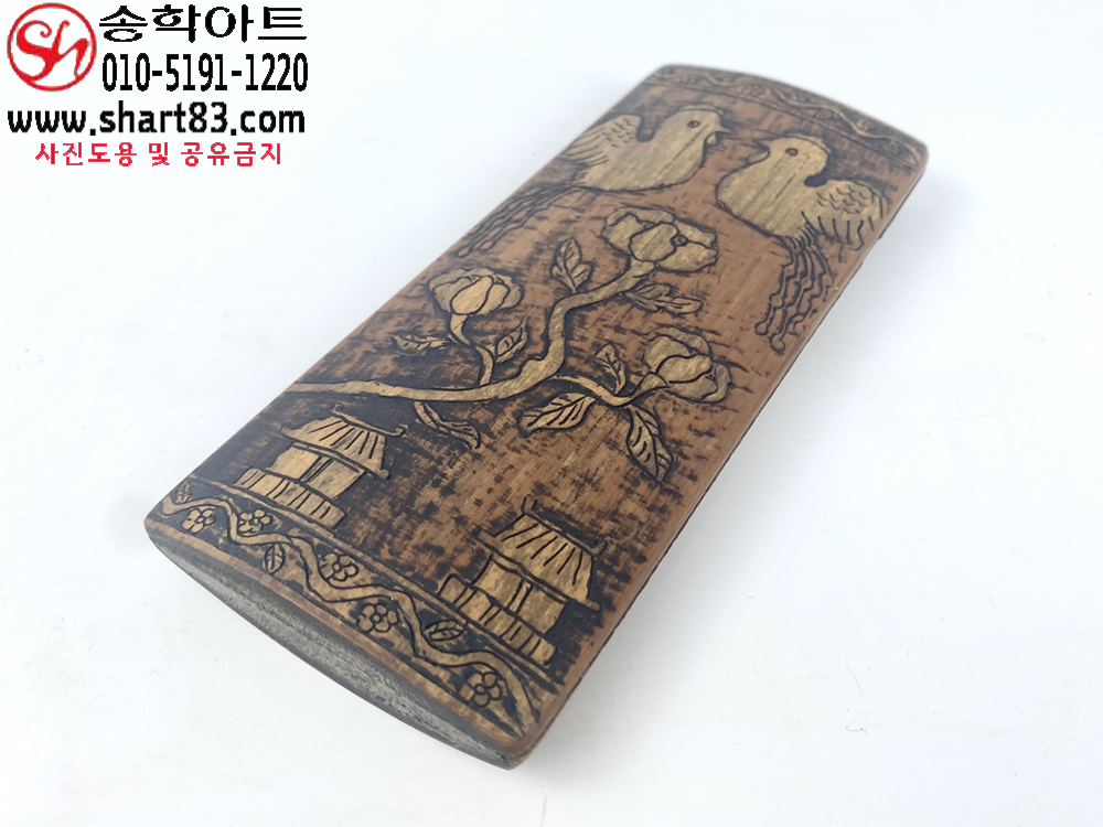 한쪽 면엔 부귀와 화합을 상징하는 쌍새(雙鳥)와 목단(모란)이 섬세히 새겨짐.