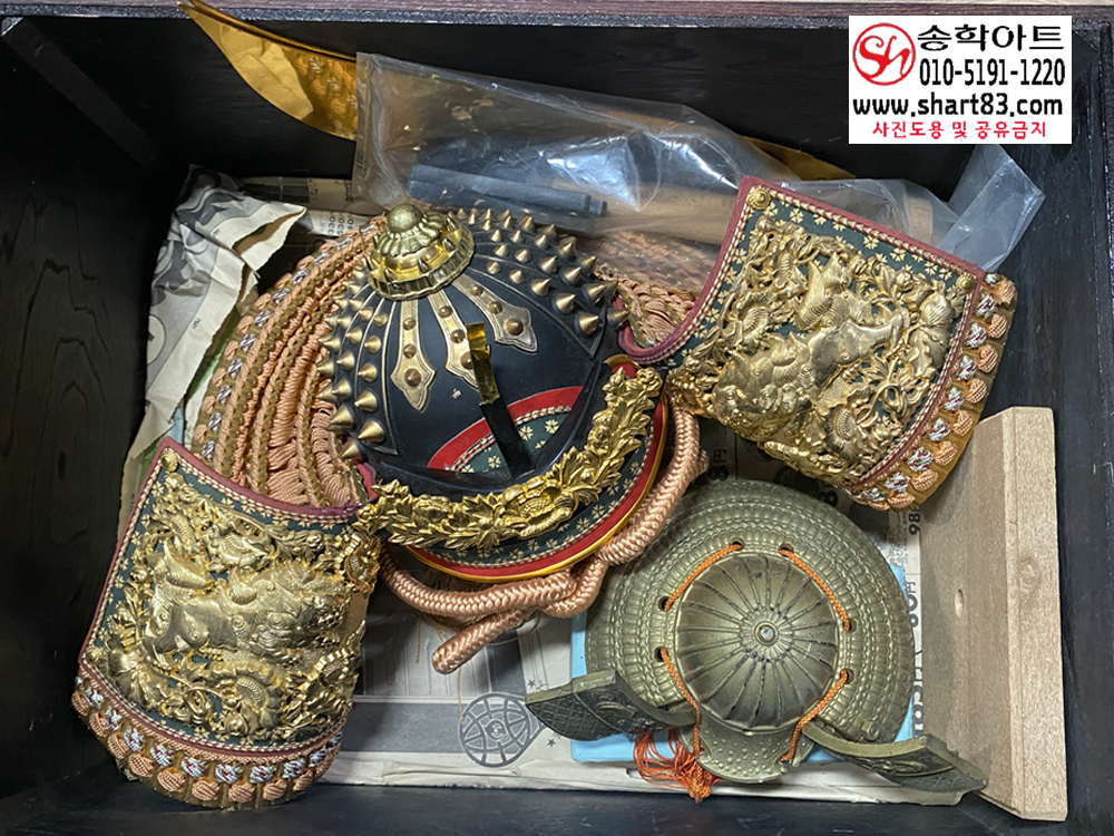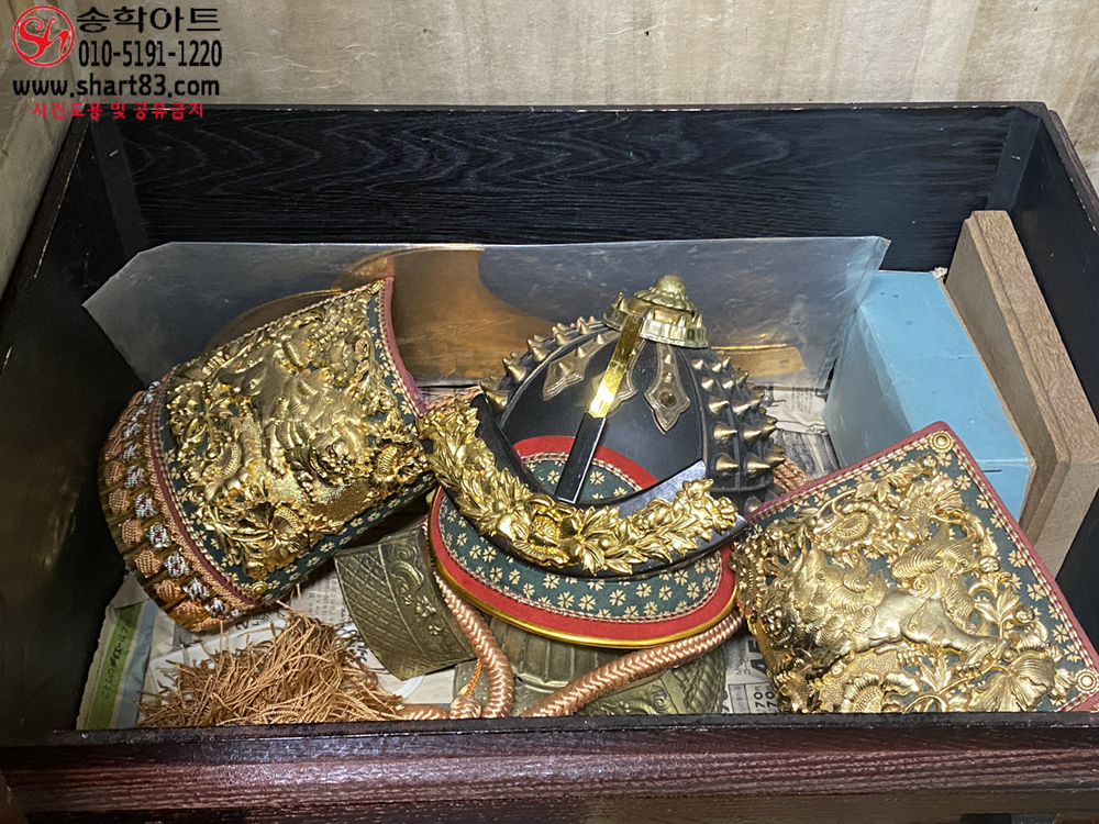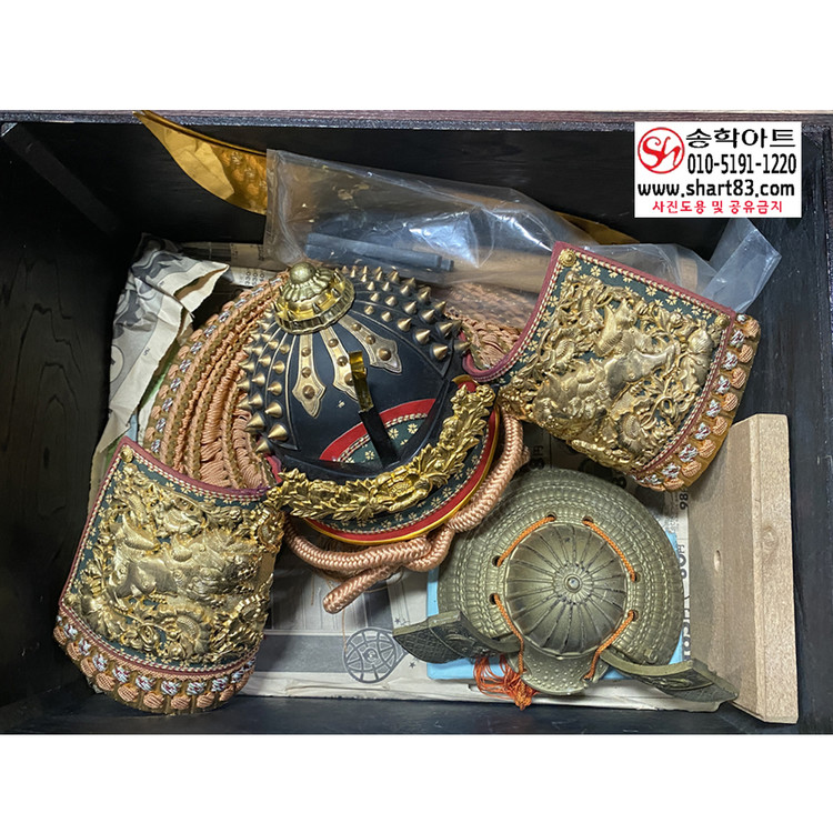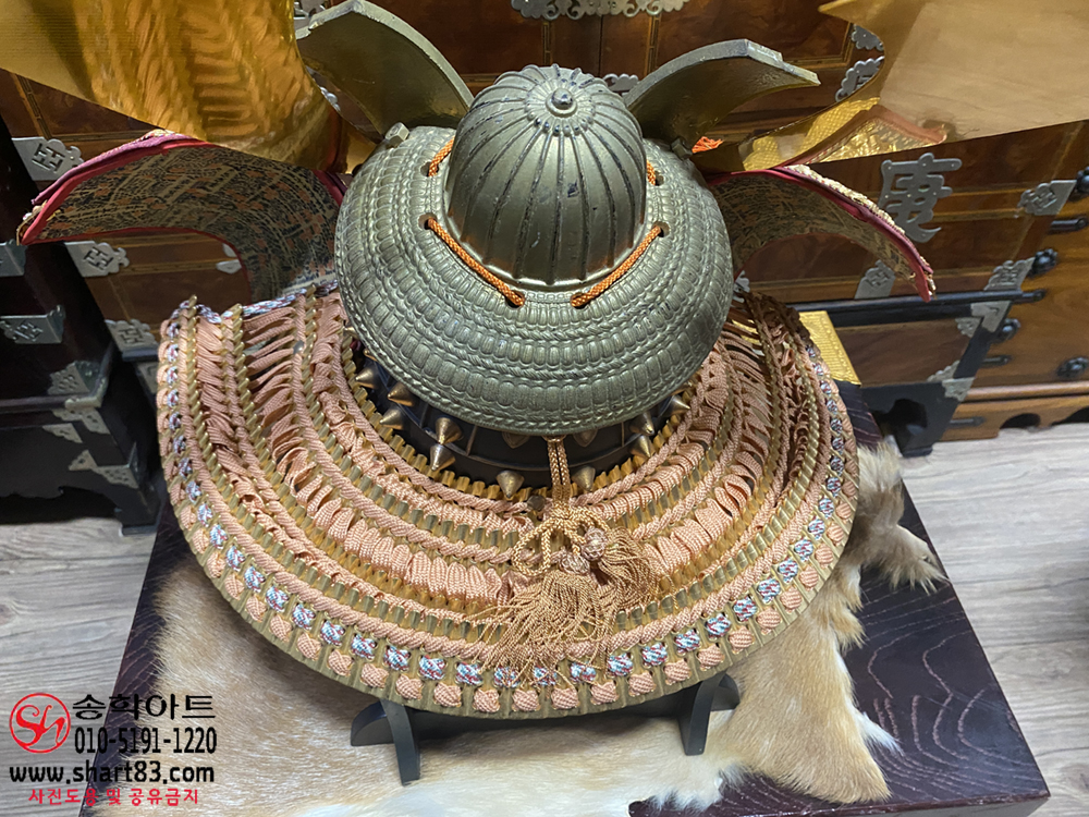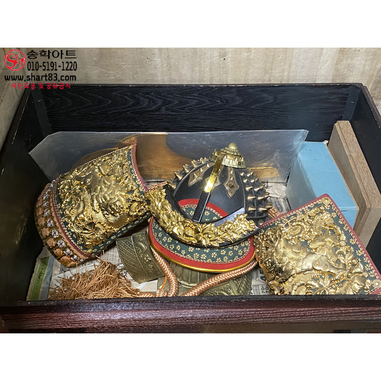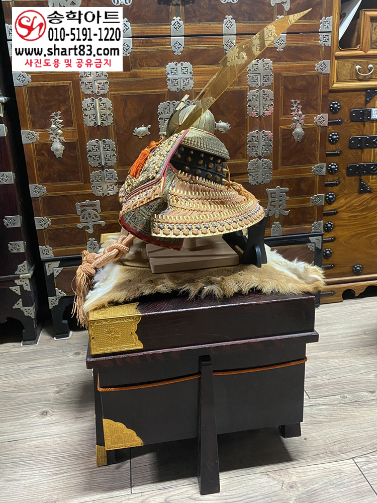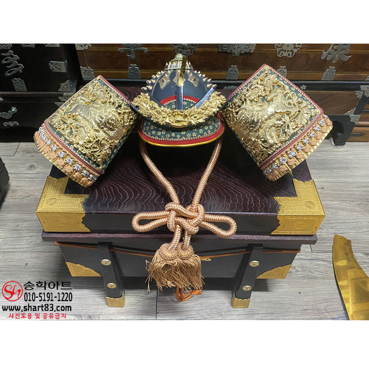 ▶ 구성 : 황금 도금 전통 투구, 누비 견갑, 목재 수납함, 장식받침 포함