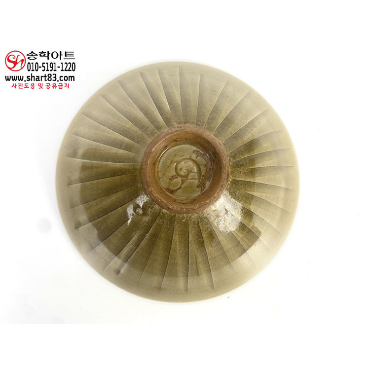 테두리에서 바닥까지 이어지는 연판 음각선과 굽 안의 나선문이 포인트로