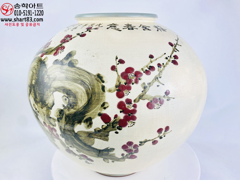 매화나무의 줄기와 가지를 휘몰아치듯 표현하고, 진사 안료로 붉은 매화꽃을